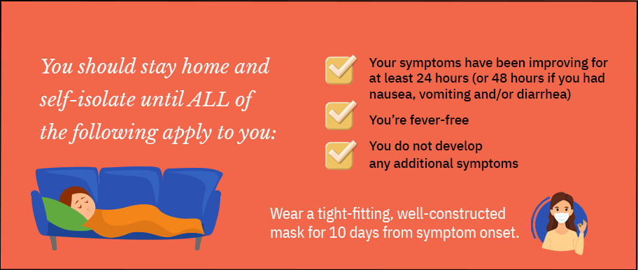 Your symptoms have been improving for at least 24 hours (or 48 hours if you had nausea, vomiting and/or diarrhea). You’re fever free. You do not develop any additional symptoms.